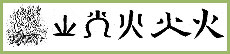 The Chinese character for fire (火 – huǒ), which has also evolved through the centuries from a pictograph to the modern, simplified character that it is today. Of course, water can extinguish fire (水可以灭火 – shuǐ kě yǐ miè huǒ). This character also carries a few other meanings related to the heat of fire, and we can see this in a few characters where the radical for fire (灬) is used, such as: